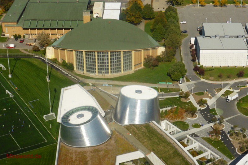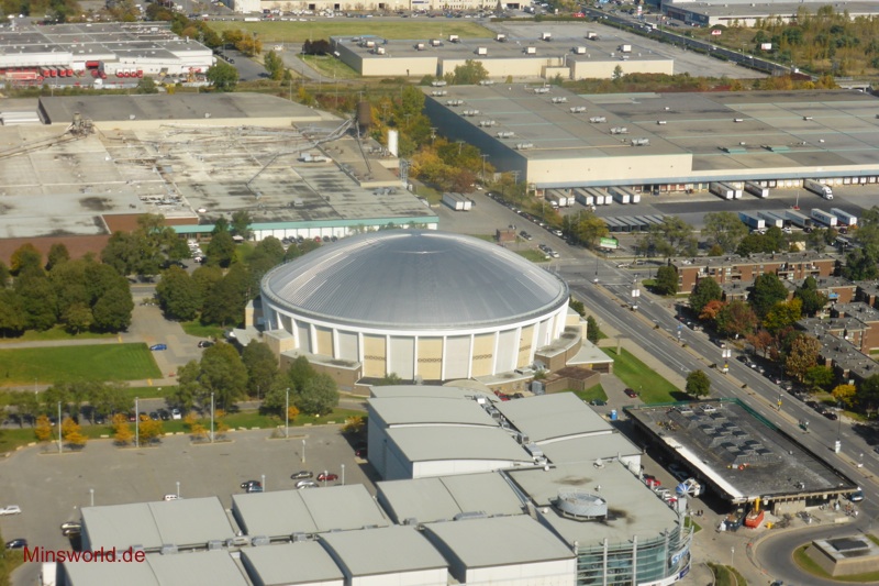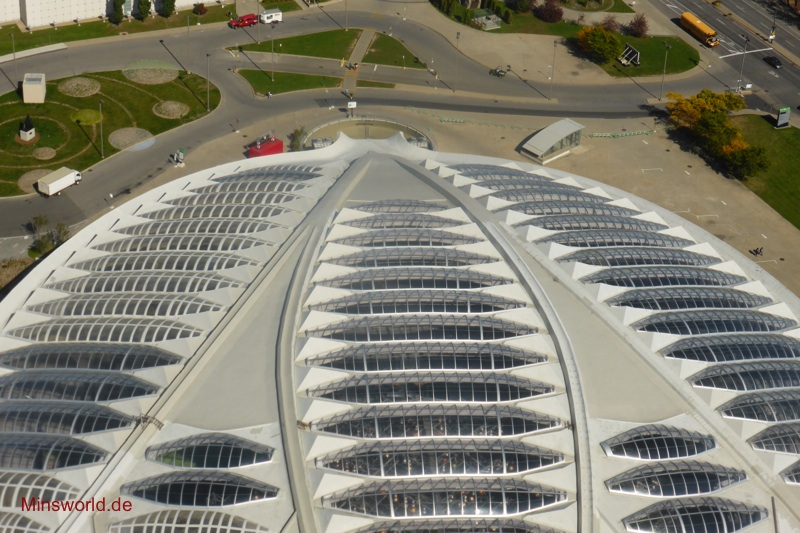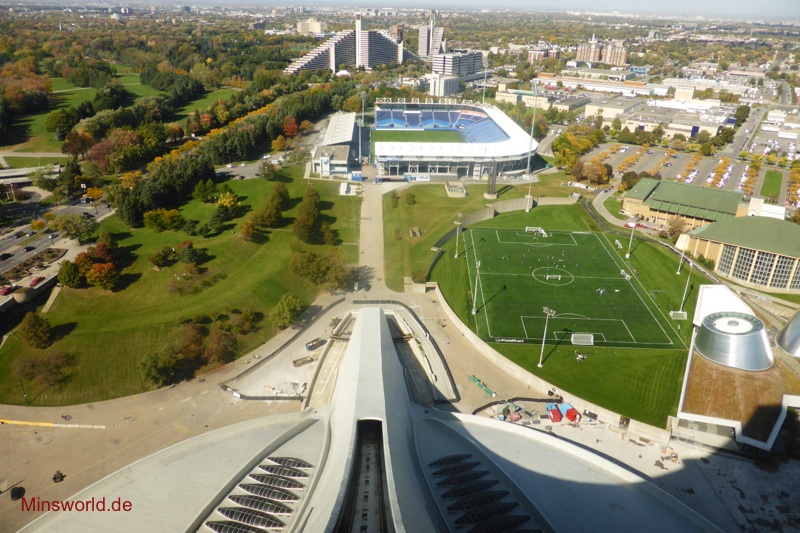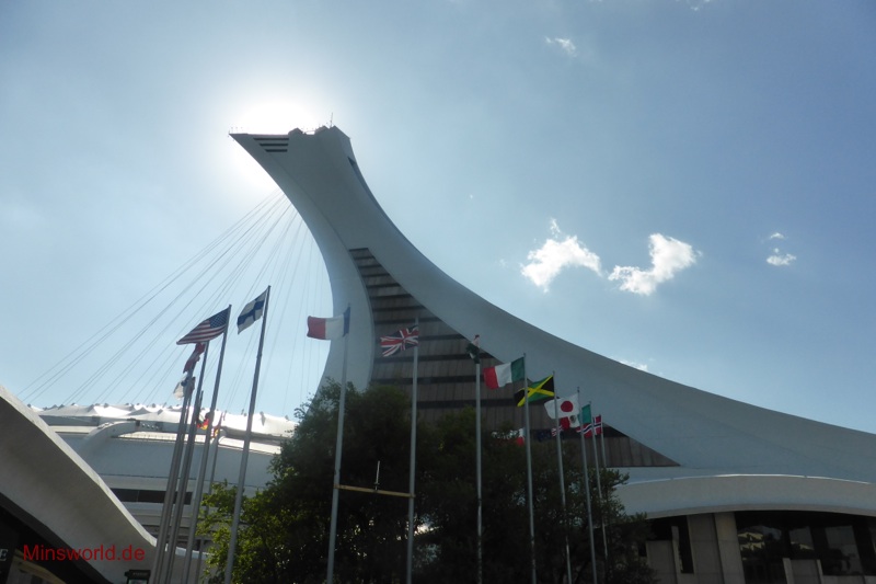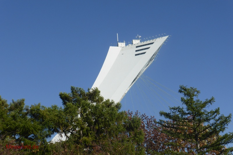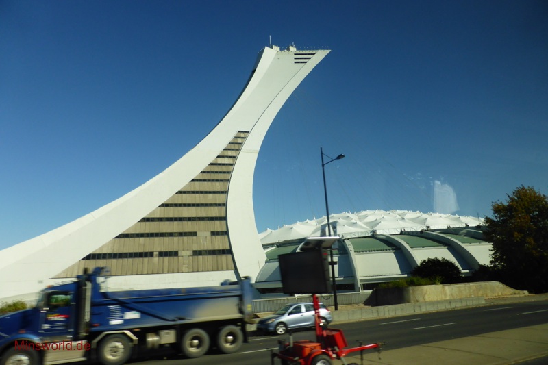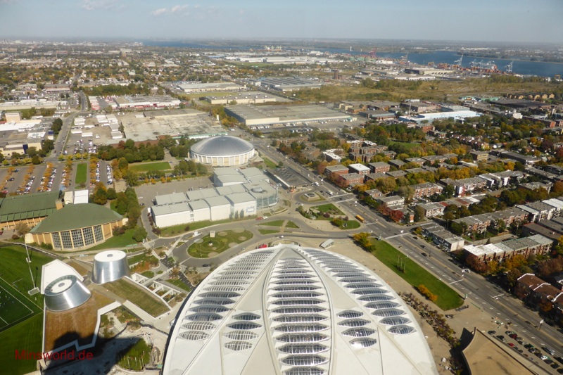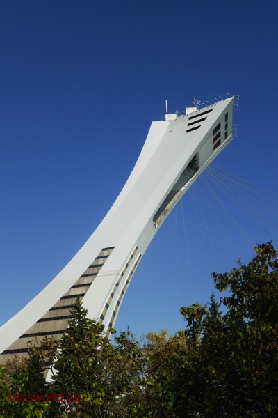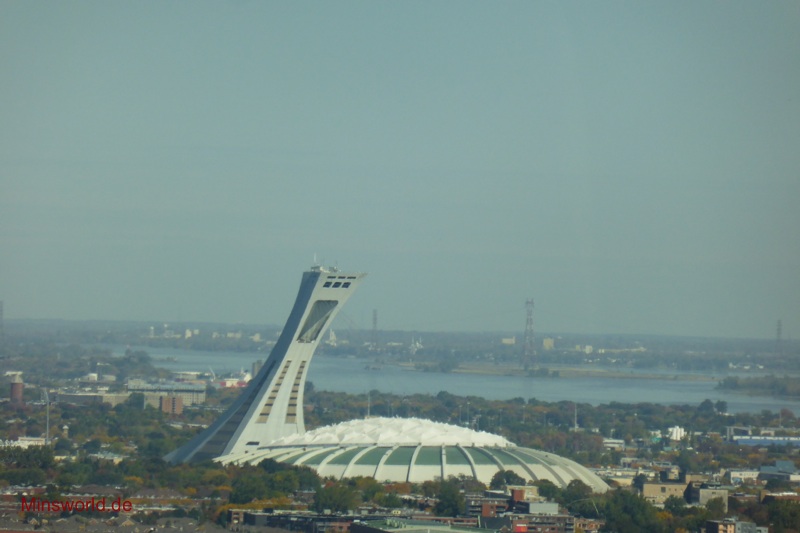 Die erste Tour führte uns zunächst in den Olympischen Park (Parc Olympique) von Montréal. Dort fuhren wir mit der Glas-Doppeldecker-Gondel den Turm des Olympiastadions hoch und genossen in 166 m Höhe die Rundumsicht auf die Stadt.