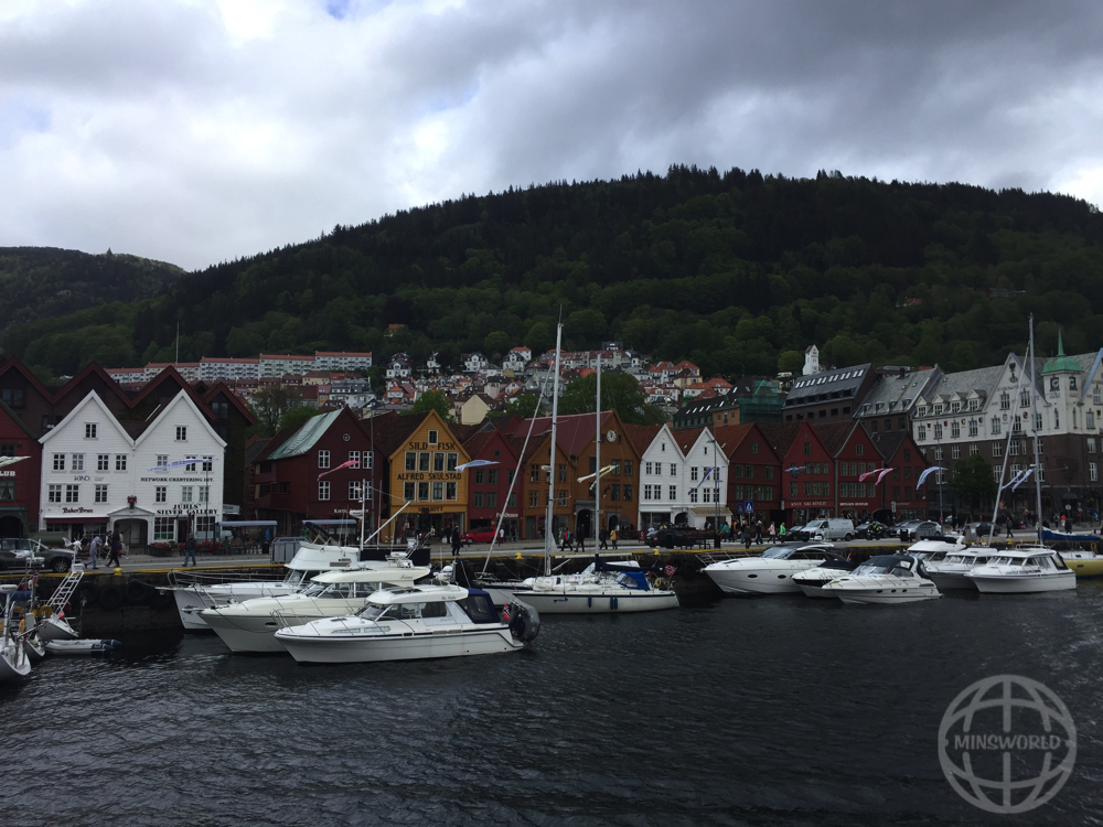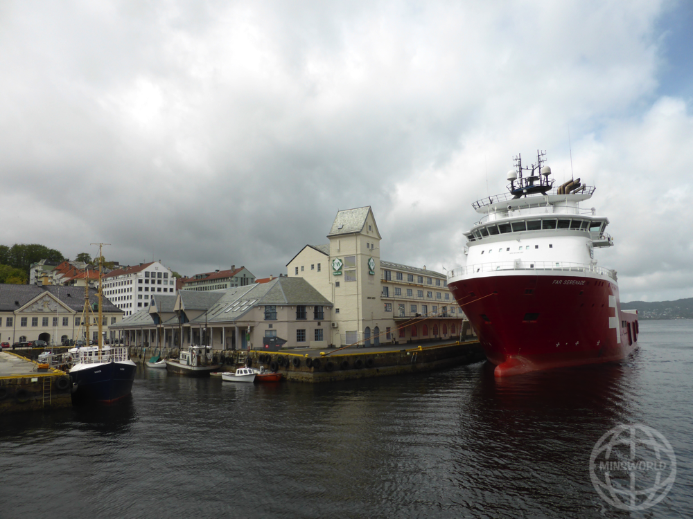 Wir hatten bereits im Voraus unsere Ausflüge für sämtliche Landgänge gebucht, für diese Stadt „Bergen mit Boot & Bus“. Wir fuhren mit dem Bus durch die Landschaft bis zu einem Bootsanleger. An diesem hätten wir die Chance gehabt, die berühmten Waffeln mit Braunkäse zu probieren, leider haben wir diese verstreichen lassen. Mit dem Boot ging es dann durch die Fjorde bis nach Bryggen. Nach einem kurzen Spaziergang entlang der Holzhäuser ging es über den Fischmarkt zu den Pendelbussen, die uns zurück zum Schiff bringen sollten, da wir das Hafengelände nicht betreten durften. Wir trennten uns jedoch vorher von der Ausflugsgruppe und gingen selbst noch ein wenig durch die Stadt. Hier ein paar Aufnahmen unserer Fjordtour und von Bergen: